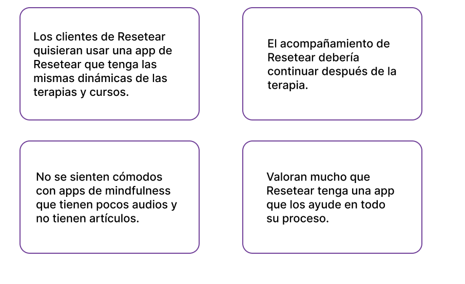 Los clientes de Resetear presentan un disgusto al no poder continuar con sus actividades de autorregulación emocional fuera de sus terapias y cursos y no se sienten cómodos utilizando otros apps que no tienen el lenguaje y actitud de sus terapias.