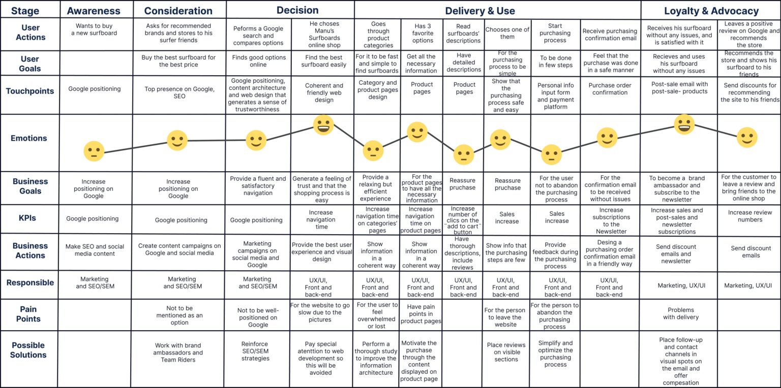 This is the customer journey before, during, and after using the website. This helps us identify pain points to alleviate them and make the design more efficient by anticipating user needs and ensuring a user-centered experience.