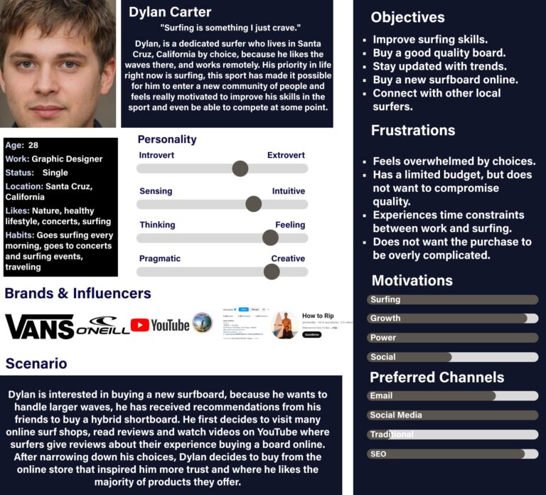 We will start by doing an analysis of the competition, understand the user group well and see what needs they have when searching for surfboards and surf accessories online. During the research phase, a group of target users between the ages of 25-50 will be interviewed, these users are committed surfers who look forward to purchasing new surfboards, accessories and clothes every year.