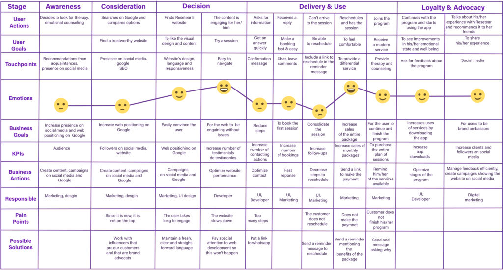 This is the customer journey before, during, and after using the website. This helps us identify pain points to alleviate them and make the design more efficient by anticipating user needs and ensuring a user-centered experience.