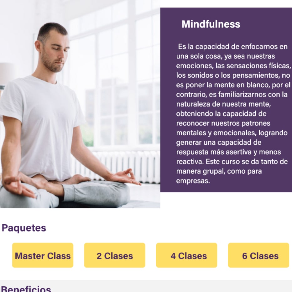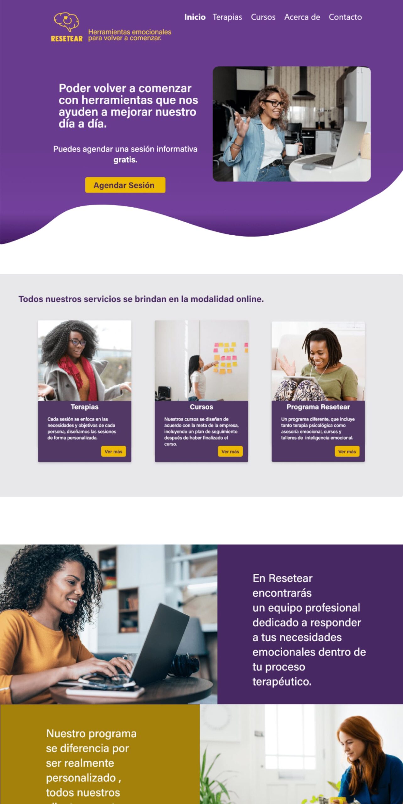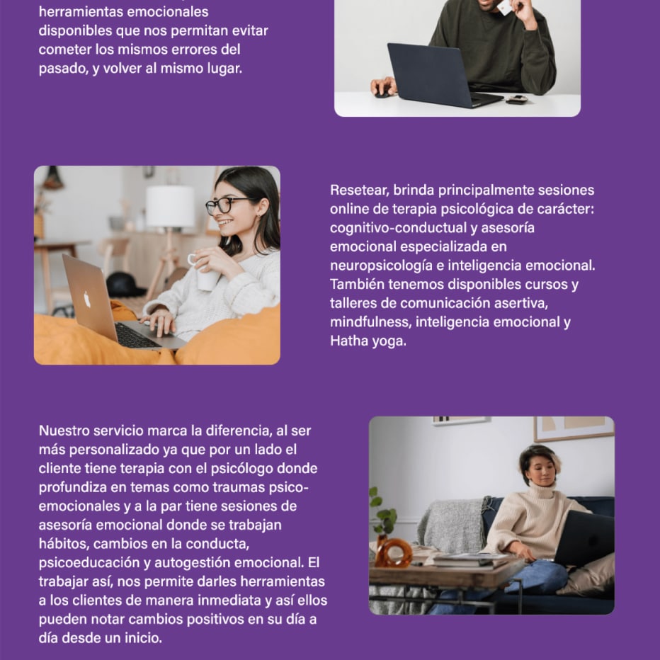 Resetear, is a project that grew from mouth to mouth, which then sought to have presence on social media and decided to have a website where it was possible for them to explain in a more detailed way how their programs work. The website, responds to its second group of audience and which Resetear partners expect to grow, this audience is made up of both men and women between the ages of 25-35. Clients who go on Google to search and request a mental health service like the one Resetear offers. For this project, surveys and interviews were conducted in order to fully capture the users’ needs.