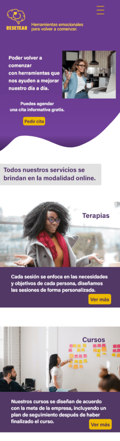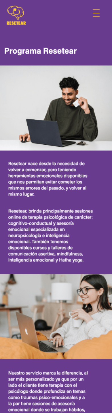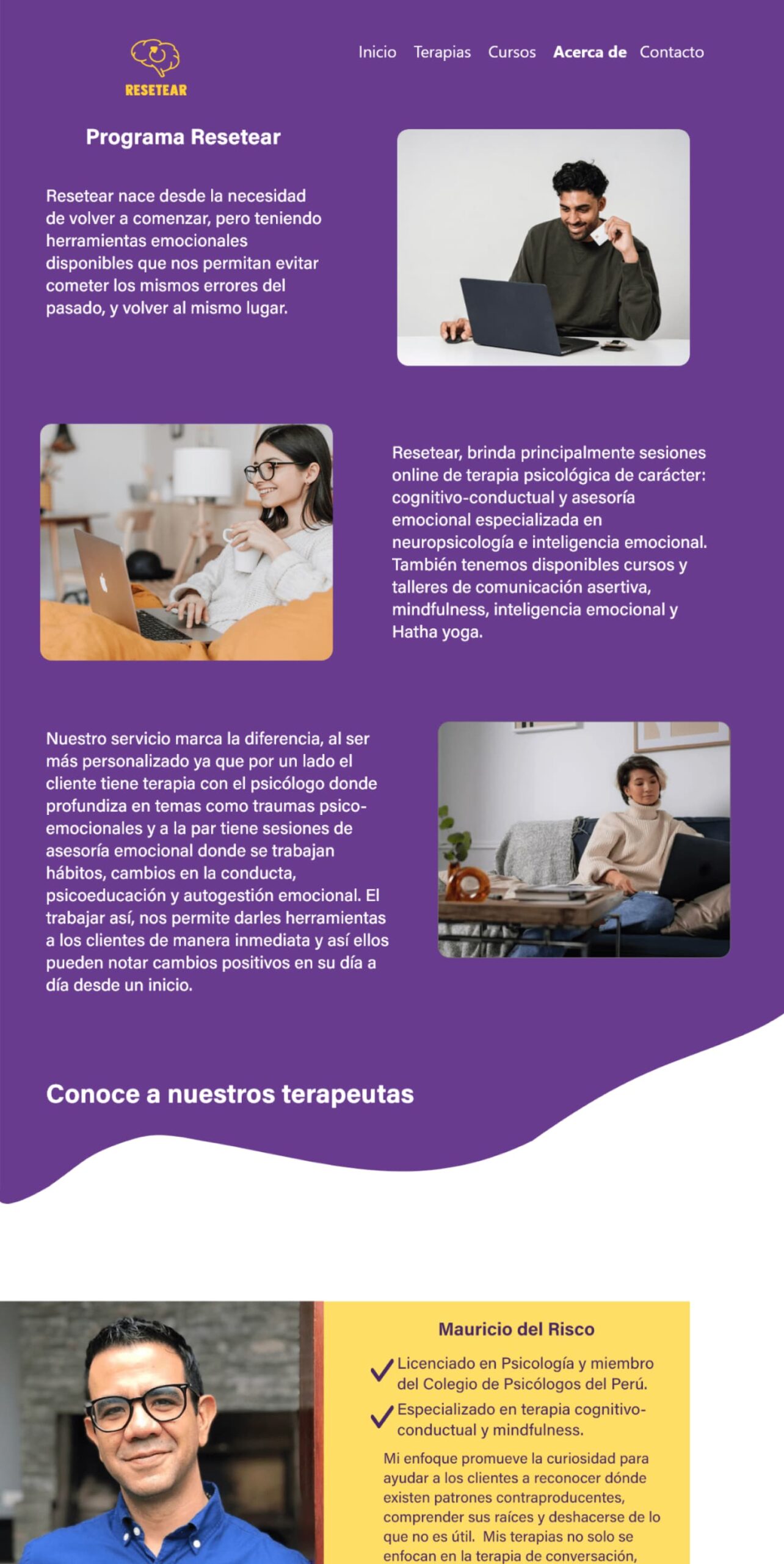 Resetear, es un proyecto que nació y creció del boca a boca, luego buscó tener presencia en redes y decidió tener una página web donde pueda explicar más a detalle la forma de trabajo tan personalizada que tienen. La página web, responde a su segundo grupo de audiencia y el cual los socios de Resetear esperan que crezca cada vez más, esta audiencia esta compuesta por hombres y mujeres entre los 25-35 años. Usuarios que tienen mayor tendencia de recurrir a Google para buscar y solicitar un servicio de salud mental como el que Resetear ofrece. Para este proyecto se realizaron entrevistas para poder captar en su totalidad las necesidades de los usuarios.